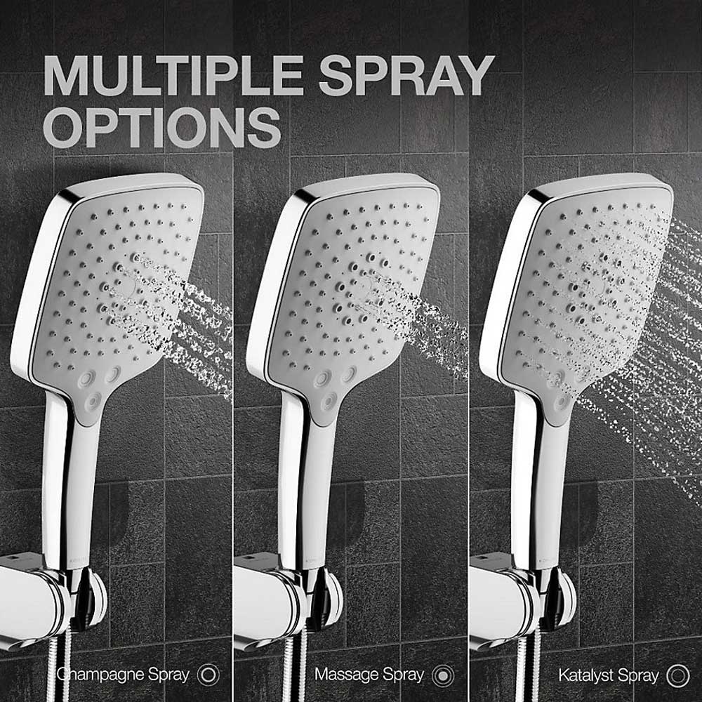 Unwind from the day with your choice of three superb KOHLER® signature spray options delivered through a wide-reaching 13 cm sprayface. This three-function handshower by Rainduet® combines both simplicity and practicality. Effortlessly switch between full coverage with Katalyst™ air-induction technology, powerful massage, and Champagne sprays depending on your preference.Features Rainduet™ handshower provides three spray experiences: full coverage with Katalyst™ air-induction technology, Champagne, and massage. Full Coverage with Katalyst™ air-induction technology delivers a drenching spray experience, ideal for rinsing shampoo from hair. Champagne spray delivers a soothing, circular water pattern. Powerful massage spray is a focused stream that targets sore muscles, or use as a utility spray to rinse kids, pets, and your shower.